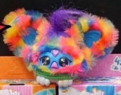 The 2nd Bootleg Pix-Elle has rainbow fur that consists of yellow, blue and red spots. The fur of the 2nd Bootleg Pix-Elle is cheaper made compared to the one the official version has and the spots are way smaller on the official version. The fur on the bootleg Pix-Elles is also missing orange spots but because of the red and yellow fur, you can also sometimes see orange spots. The 2nd Bootleg Pix-Elle has a blue faceplate and blue inner ears unlike the 1st version. The 2nd Bootleg Pix-Elle also has a purple hair tuft. The 2nd Bootleg Pix-Elle has white feet like the rest of the Bootleg Furblets. The 2nd Bootleg Pix-Elle has a pink heart gem and a pink beak unlike the yellow parts in the 1st version. The 2nd Bootleg Pix-Elle appears to have pink spots the official version does not have. The 2nd Bootleg Pix-Elle has blue eyes with lightning bolts in them.