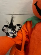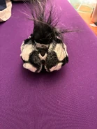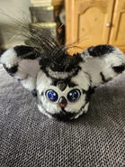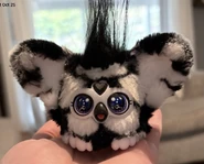 This Furblet has white fur with some black spots to represent a soccer ball. It has two ears with white insides, white feet and a black hair tuft. It has a white faceplate with two blue to purple gradient eyes. It has white spikes on its pupils, and two black eyelashes. Its eyes have soccer balls in them. Goal-Ee has a grey heart gem and a black beak with a hot pink tongue. It comes with a black backpack clip.