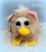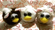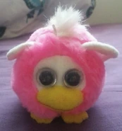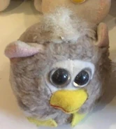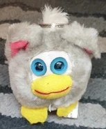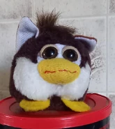 These plush toys have an oversized beak (similar to a Foobie’s beak) with two beady eyes, a very stout, round body, and two short ears. They also can have a patch of white near their eyes which is supposed to resemble a Furby's face plate. They have feet made from felt, and a cord attached behind them which can be pulled, causing them to vibrate and move around.