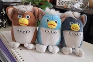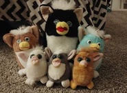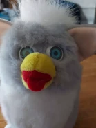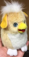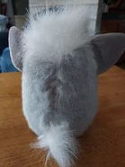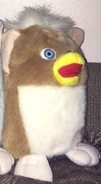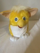 The plushes resemble an original Furby with the same type of eyes. They are only known to come in yellow, pink, blue, black, brown, or a bluish-grey. They have pink inner ears, and a white pair of feet, tail, and tuft of fur on their heads. Likewise, they are 6 inches tall. Their tags have a code consisting of numbers and a letter, while the other side of the tag reads "Made in China". The inside of its mouth is red, and it has a red, felt tongue poking out of its mouth.