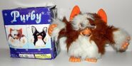 This version of Purby has a small mouth, brown and white fur with a large patch of white for its tummy, and orange ears. This version can be seen at the back of the box. It has a patch of fur around its left eye, and white fur on the lower part of its arms.
