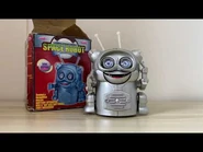 Space Robot is a knockoff of Gigabot, with a very similar appearance to it. It has a pair of silver lips, two plastic, white antennae, a red tongue, gray eyelids and a small bump on its stomach between two screws. It has two red lights on its head that flash as it plays music, but lacks an infrared sender and receiver. This version of Space Robot has its feet sticking out a bit, unlike Gigabot which has its feet completely molded on. It also has a pair of arms and a backpack on its back. Unlike Gigabot, the toy has a pair of blue eyes. The toy has bump and go wheels beneath, allowing it to turn from an object it bumps into and continue moving. Unlike a Furby, Space Robot has an on/off switch.
